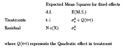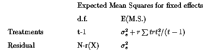 The example given in the CRD considered 6 'treatments'. These were fixed effects; we chose these 6 'treatments' and we could repeat the experiment again and use the same 6 treatments. Our results pertain only to these treatments and cannot be extrapolated to any others. In general then, with t 'treatments', or classes, and r observations, or experimental units, per class we will have the following Expected Mean Squares from our Analysis of Variance table.