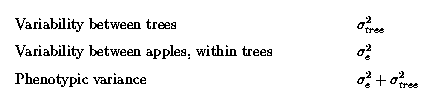 Another class of effects are random effects. Suppose that we are interested in variability within and between apple trees in the weights of apples. We randomly select 6 trees (perhaps from the Macdonald orchard) and then randomly pick 4 or 5 apples per tree. Our interest is in the variability between apples within trees and between trees.